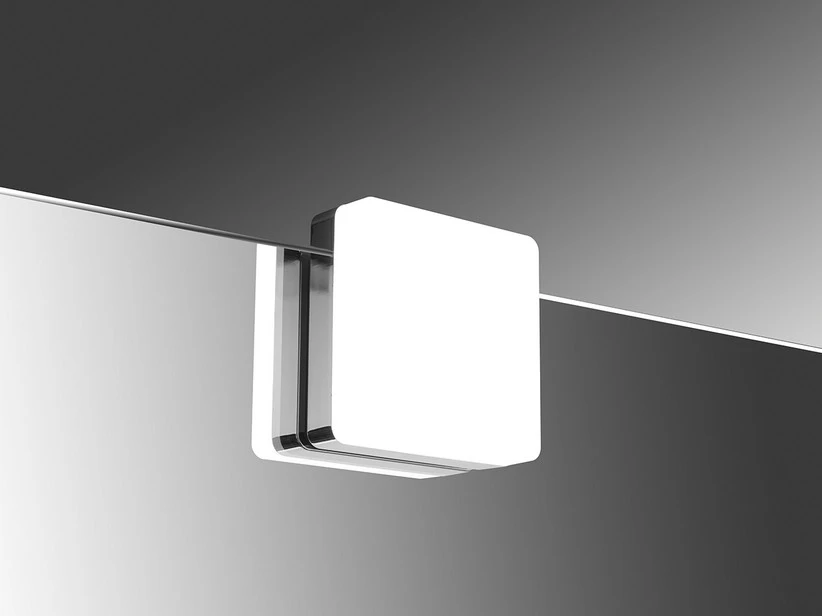 SOLAR Lampada a LED design quadrato cm. 7,5×7,5 cm realizzata in ABS cromato, con diffusore in policarbonato. Illuminazione CLII-IP44-3,9W-230V-50Hz, modulo led non sostituibile, 459 Lumen – temperatura luce 4000°K. Fissaggio solo per specchi a filo lucido, non necessita di alimentatore – CLASSE ENERGETICA (E)